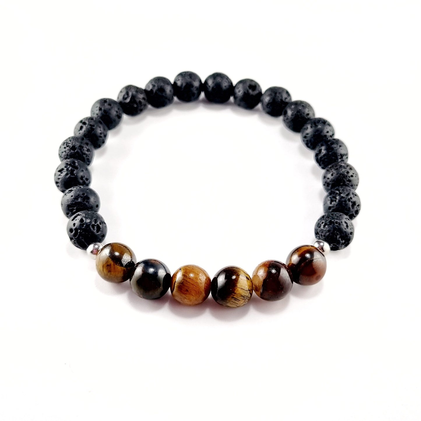 Esta pulsera cuenta con cuentas redondas de ojo de tigre y piedra volcánica, ambas de 8mm de diámetro, elegidas especialmente por sus cualidades únicas y complementarias:- Ojo de Tigre: Conocida como una piedra de protección, el ojo de tigre ayuda a mantener el equilibrio emocional y fomenta la valentía y la determinación. Su brillo dorado y marrón es símbolo de fortaleza, alentando a quien la porta a enfrentar los desafíos con confianza.
